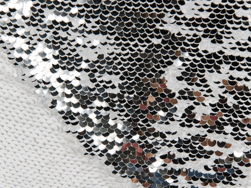 Color: Sequin fabric of white and silver, white polyester